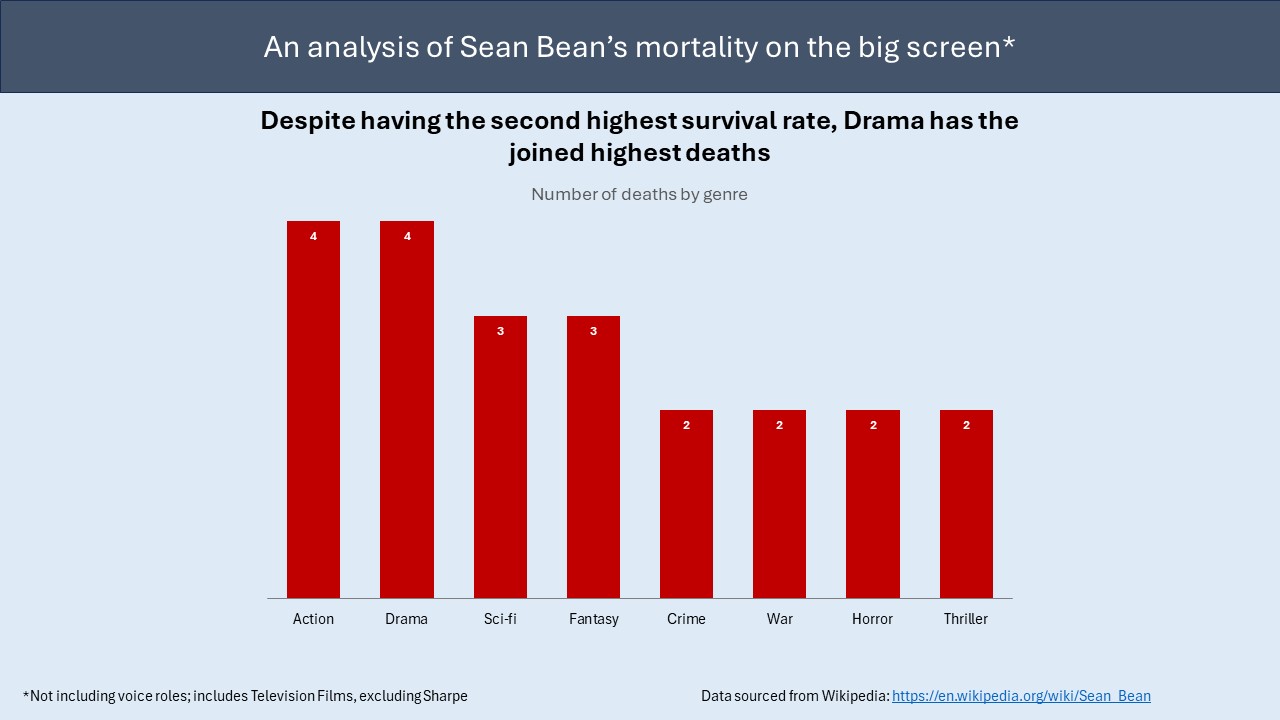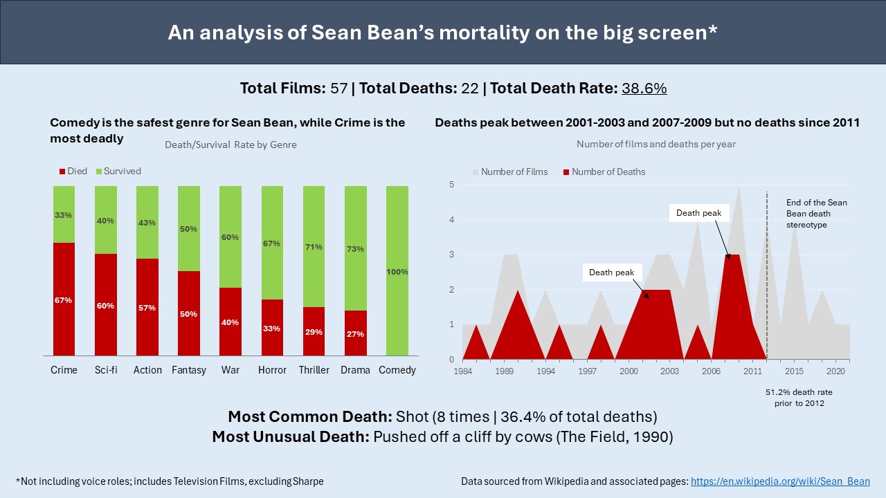 This was a fun analysis project I performed to examine the truth behind the feeling that Sean Bean's characters seem to die in every film he is in. To do this, I first collected data on every film that Sean Bean has starred in. This included the name of the film, the year of release, genre, whether the character died or not (1 for yes, 0 for no), and the cause of death. From this I calculated the death rate by genre, the number of films vs. number of deaths over time, as well as general summary statistics.